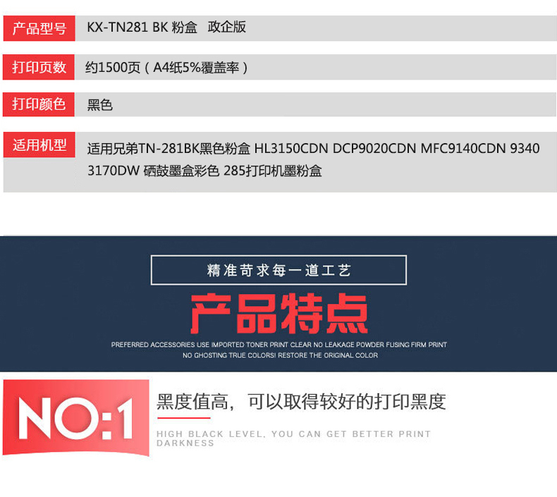 凱欣KX-TN281BK 適用兄弟TN-281BK黑色粉盒 HL3150CDN DCP9020CDN MFC9140CDN 硒鼓墨盒彩色 全國統(tǒng)一價(jià):268元